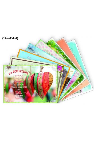 12 Faltkarten mit 8 verschiedenen Motiven und Bibelversen zum Geburtstag.
