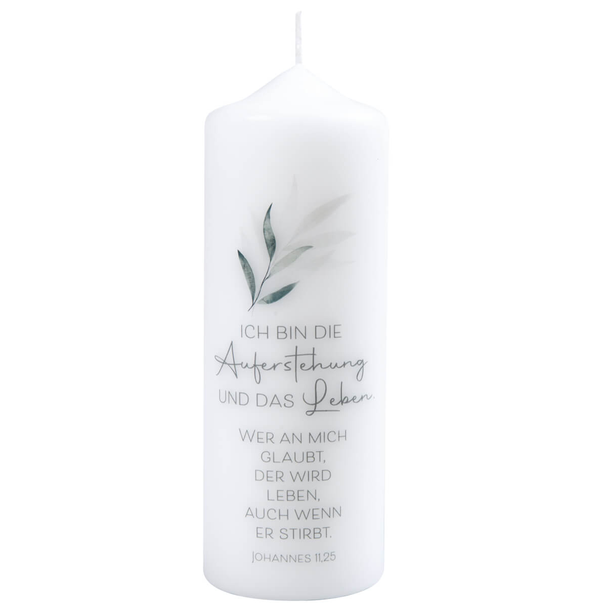 Modern gestaltete Gedenk-Trauerkerze mit Motiv Zweig und Text: Ich bin die Auferstehung... Johannes 11,25.