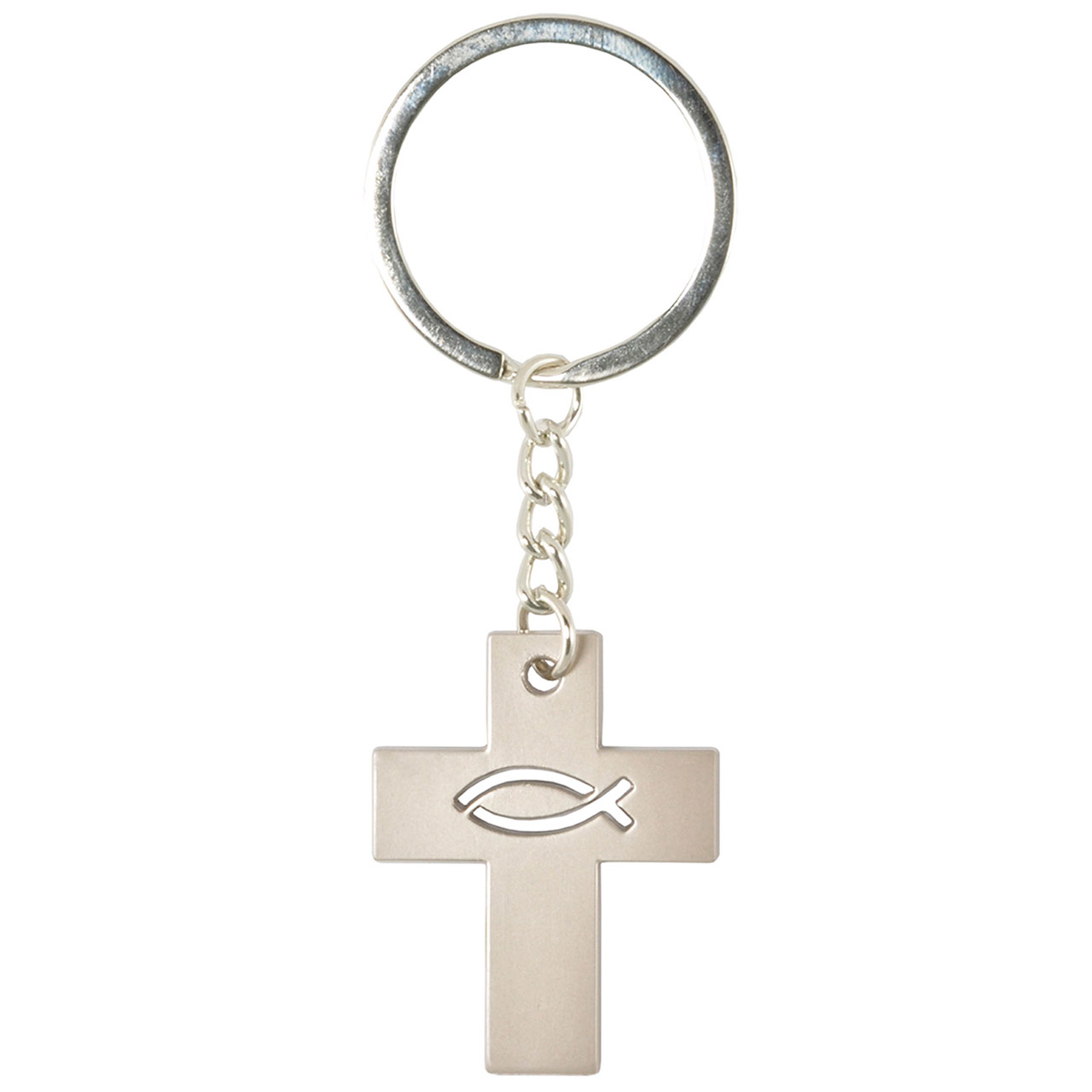 Aus Edelstahl gefertigter Anhänger mit Schlüsselring und Kreuz mit ausgelasertem Fisch.