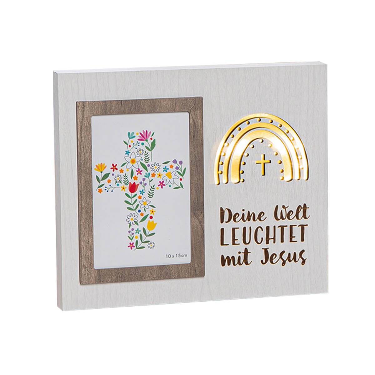 Fotorahmen mit LED Regenbogen "Deine Welt leuchtet mit Jesus"
