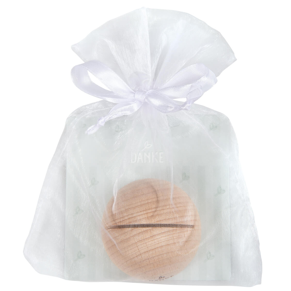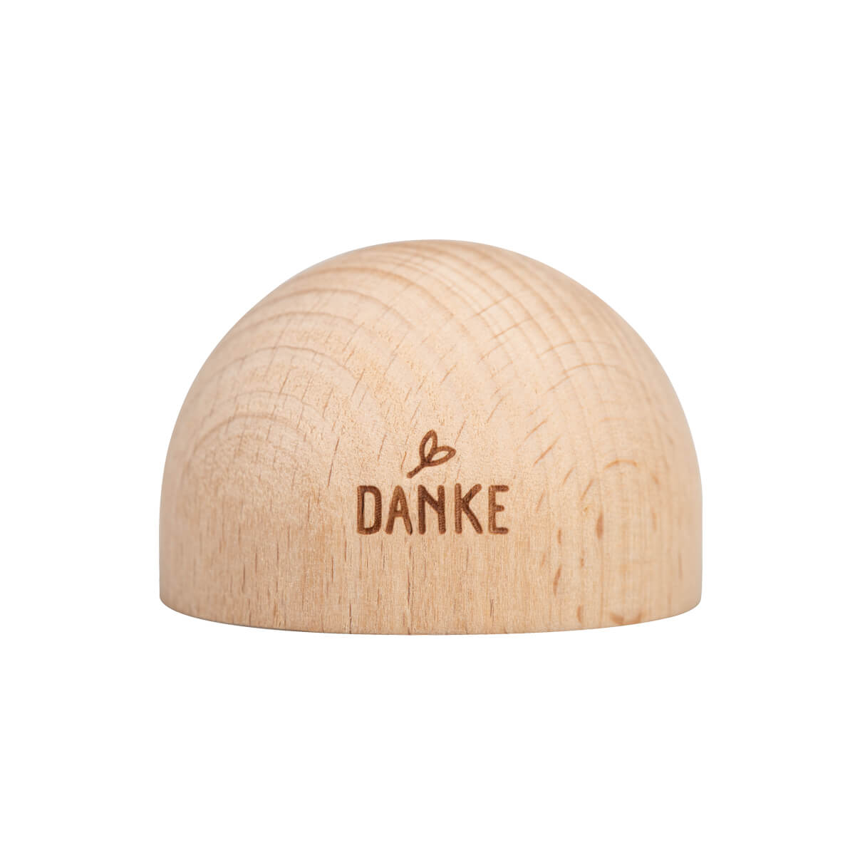 Mit seinem lasergravierten Wort "Danke" mit Miniatur-Symbolen ist der Kartenhalter mehr als nur ein praktisches Geschenk. Besonders schön im Organzabeutel verpackt mit passender quadratischer Postkarte, die zudem mit partiellem Lack und abgerundeten Ecken veredelt ist.
