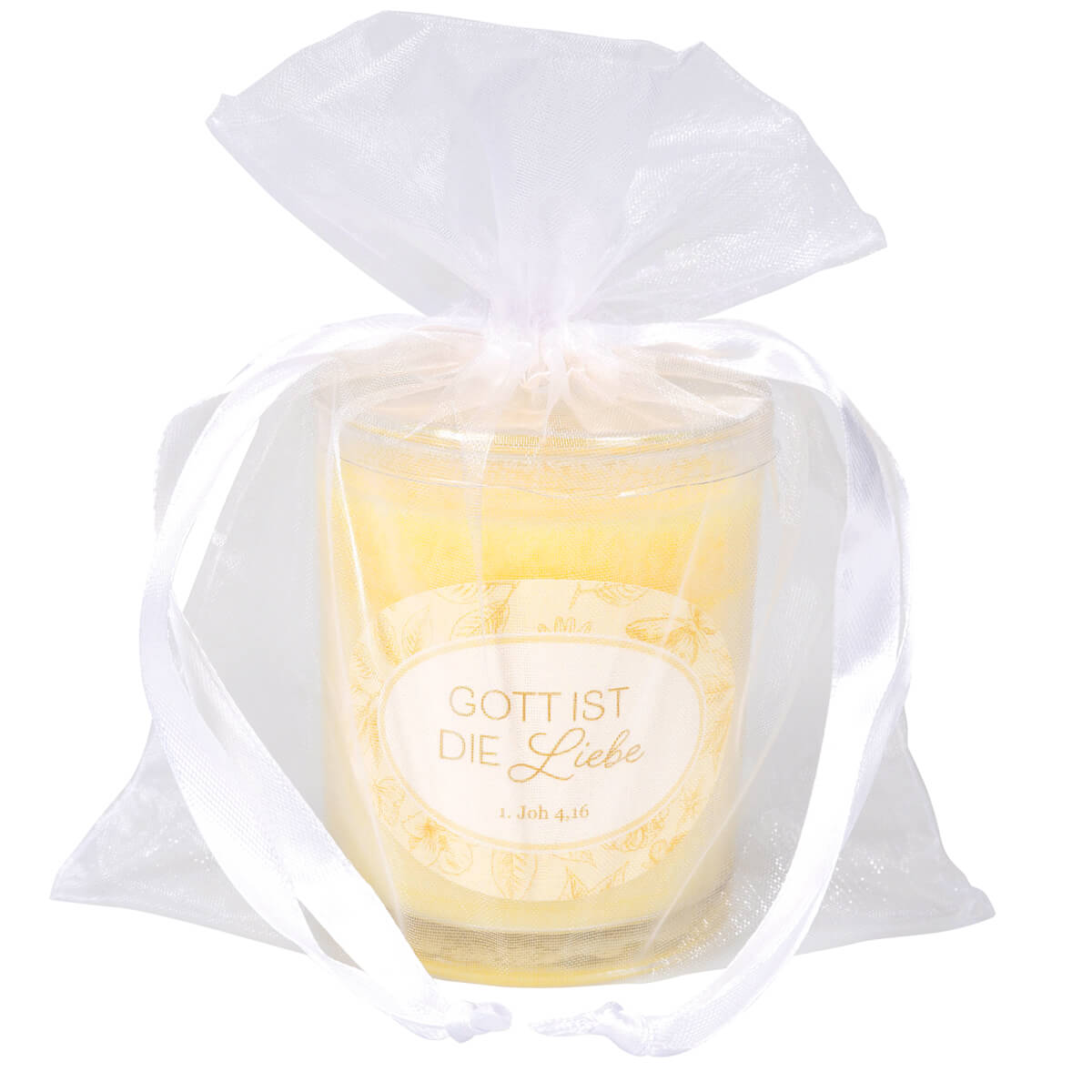 Duftkerzenglas mit schön gestaltetem Etikett "Gott ist die Liebe".
