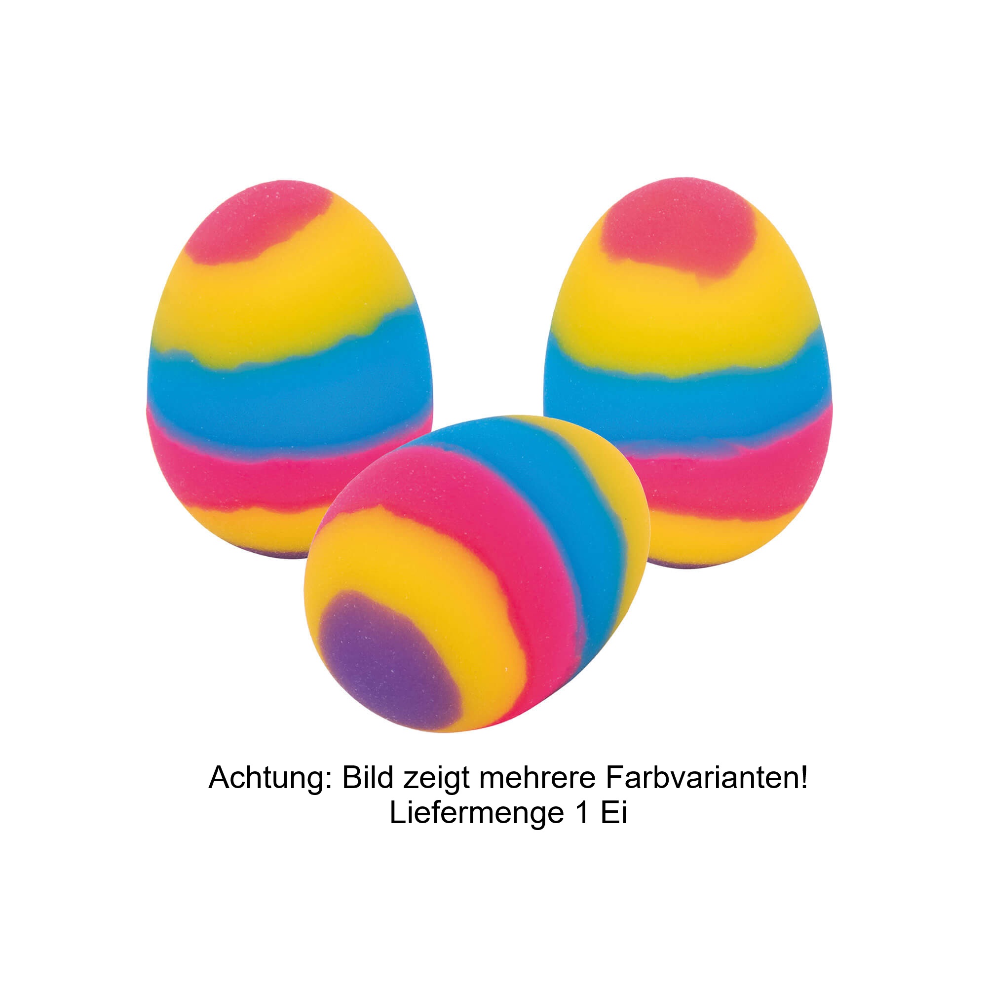 Der springt wohin er will! Der kunterbunte Flummi in Form eines Eies ist der Blickfang in jedem Osternest.