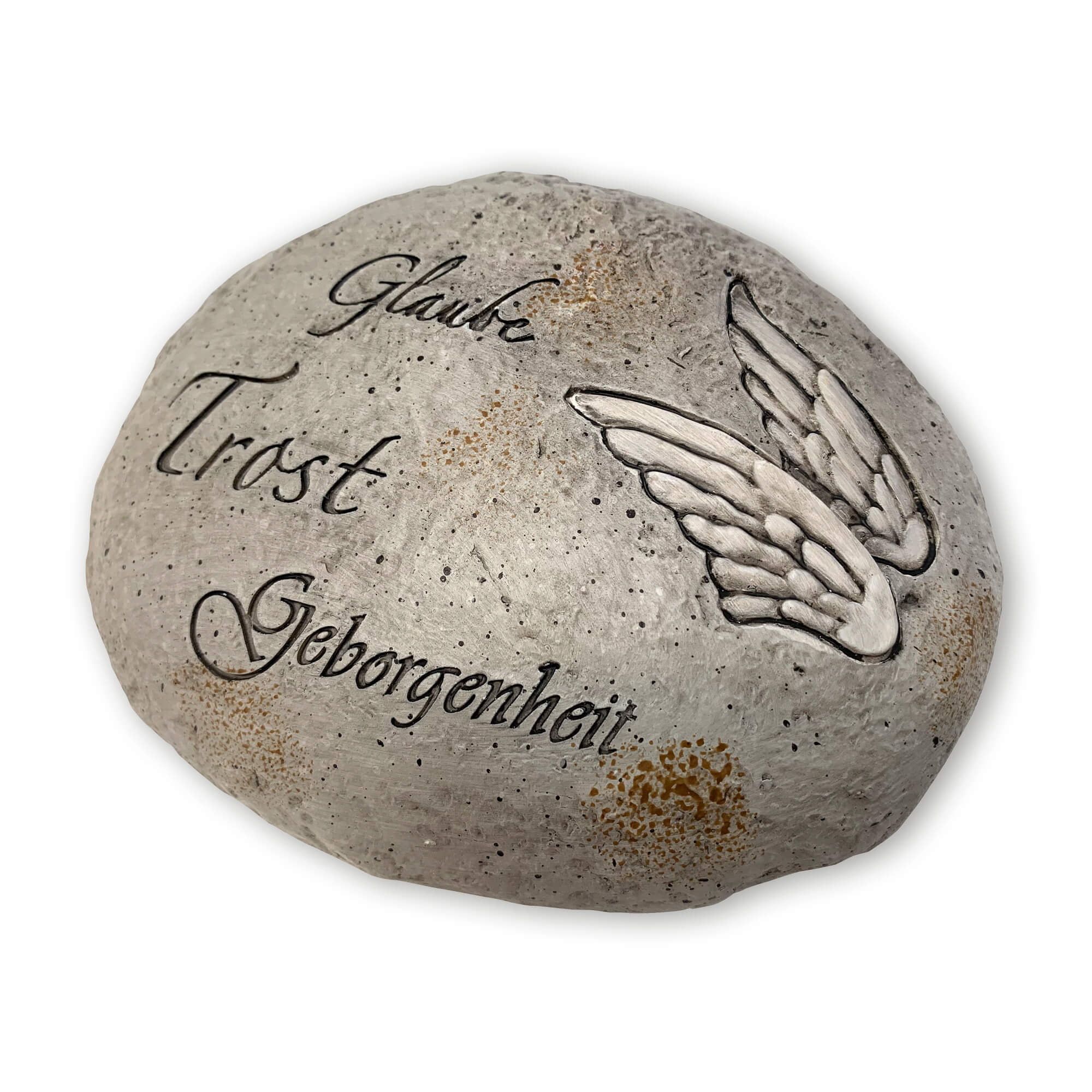 Schöner Grabschmuck: Grauer Stein aus Kunststoffguss mit den Worten "Glaube, Trost, Geborgenheit" und Schutzengel-Flügeln, ca. 14 x 11 x 6 cm