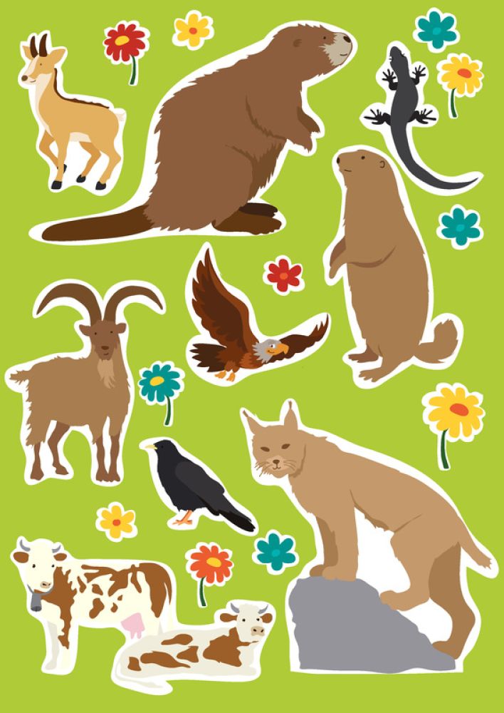 Vervollständige die farbigen Doppelseiten mit den beiligenden Aufklebern und male die Ausmalseiten an.