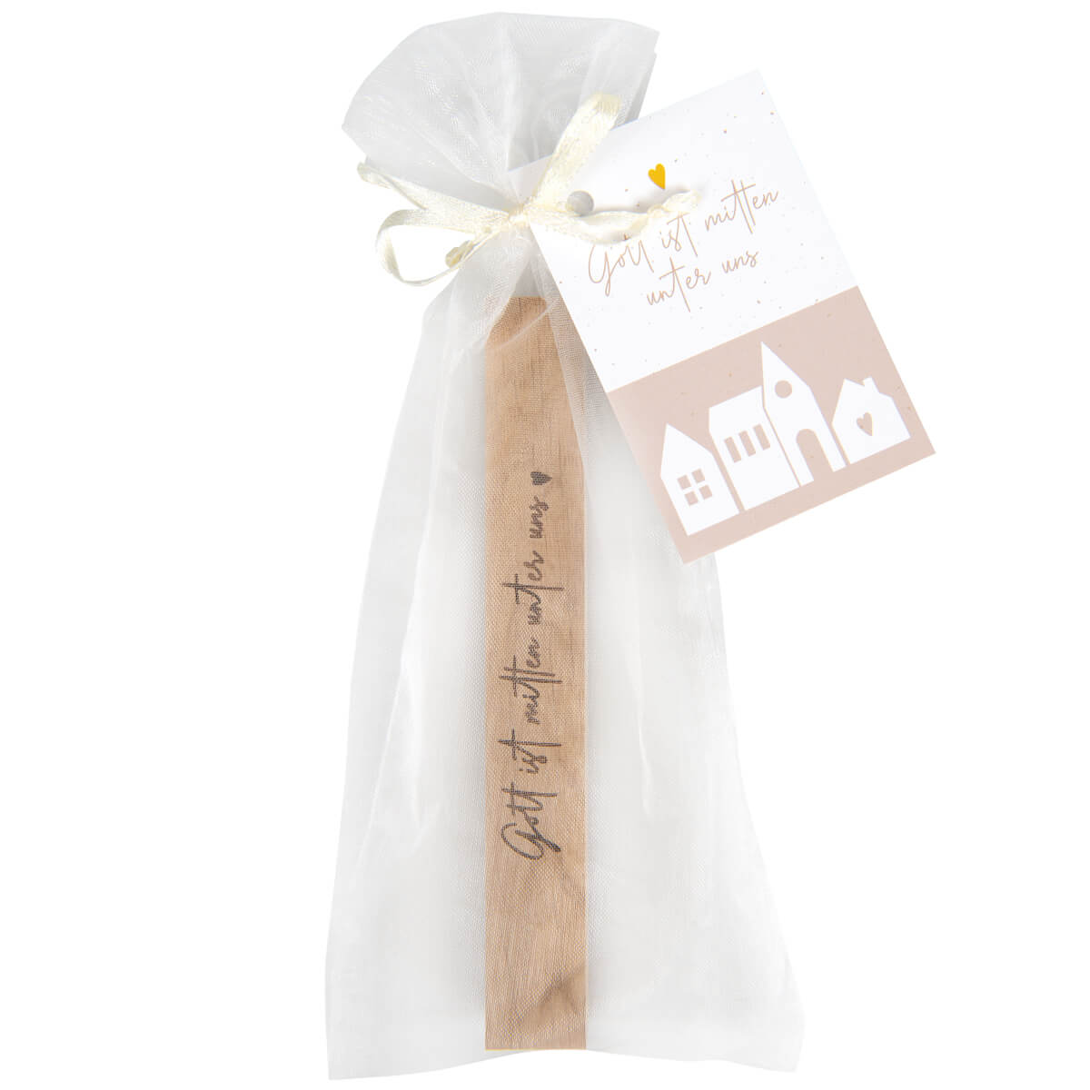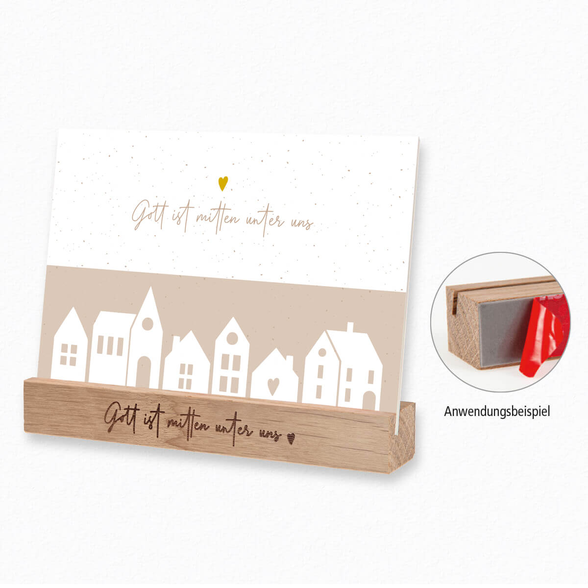 Kartenleiste aus Eichenholz, veredelt mit Lasergravur: "Gott ist mitten unter uns".