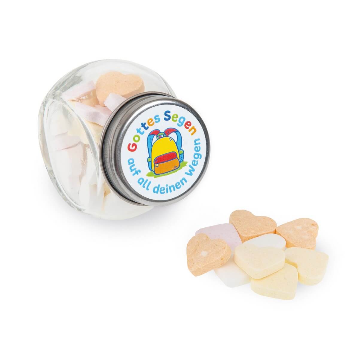 Eine süße Geschenkidee: Kleines Bonbonglas mit Text auf dem Deckel: "Gottes Segen auf all deinen Wegen".