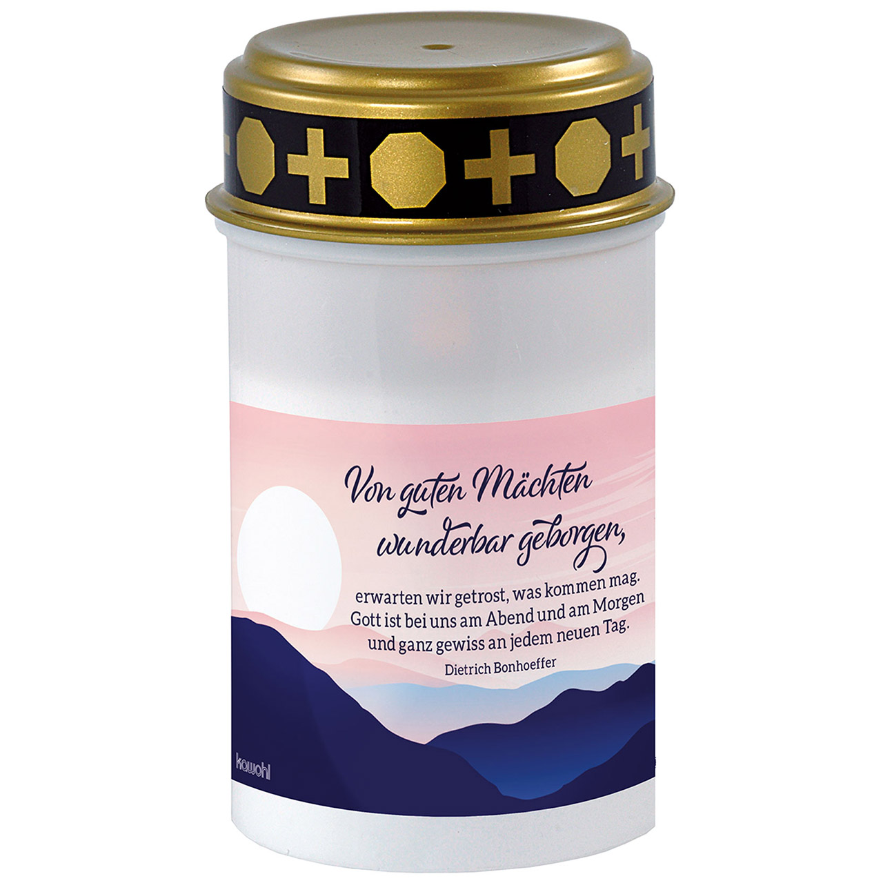 Grafisch gestaltetes Grablicht mit dem bekannten Text von Dietrich Bonhoeffer. Zum Gedenken an unsere Lieben und zum Mut machen für die Hinterbliebenen.