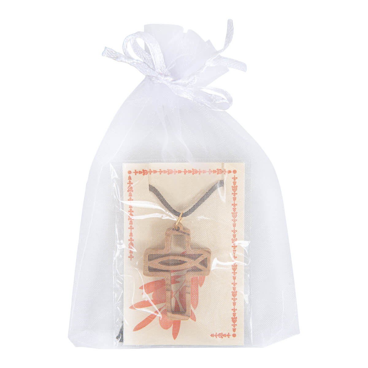 Schlichter Schmuck: Halskette mit Kreuz aus Olivenholz. Mit filigran herausgearbeitetem Fischsymbol.