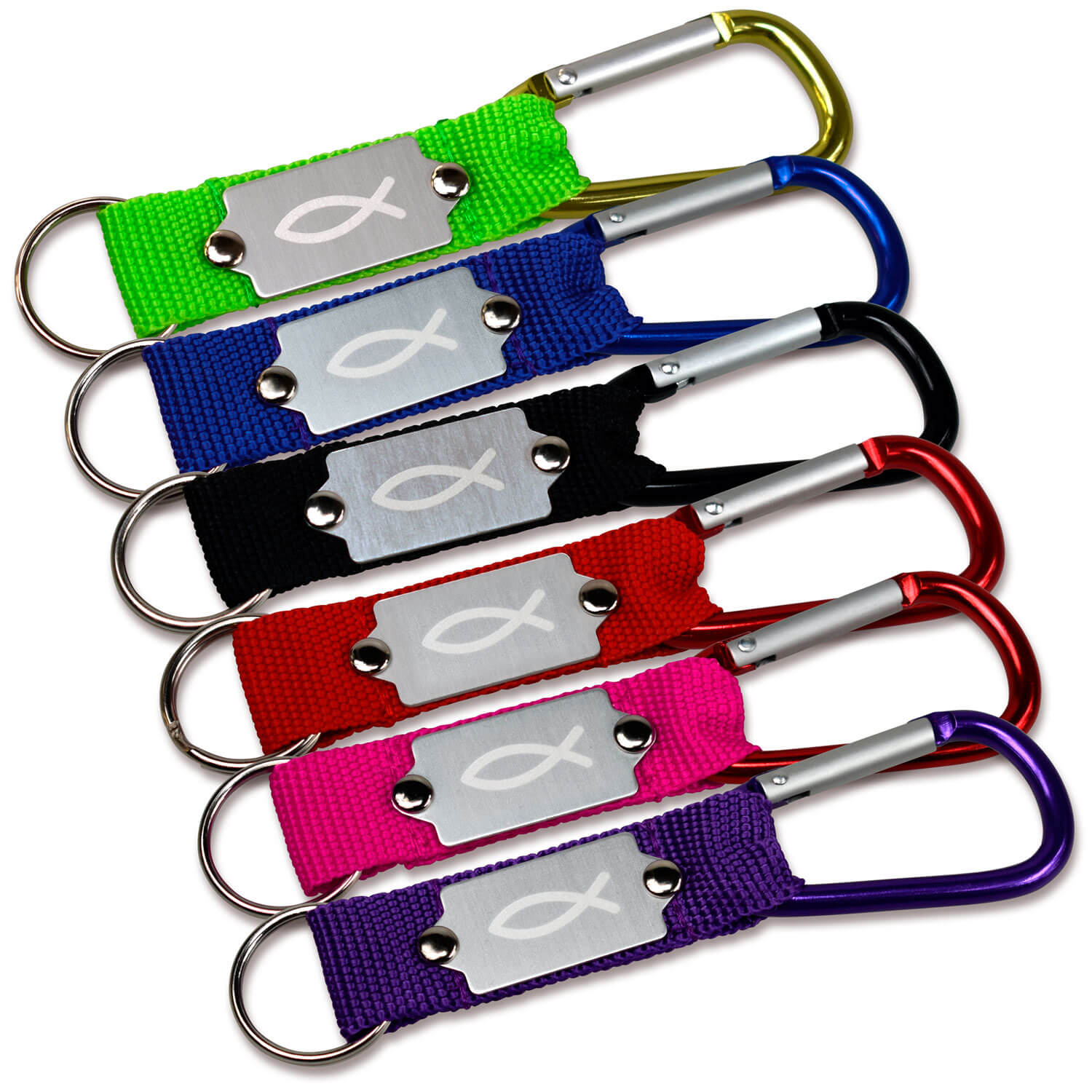 In sechs verschiedenen Farben ist der Schlüsselanhänger erhältlich. Auf der Metallplatte, die sich auf dem farbigen Nylonband befindet, ist das Ichthyssymbol eingraviert.