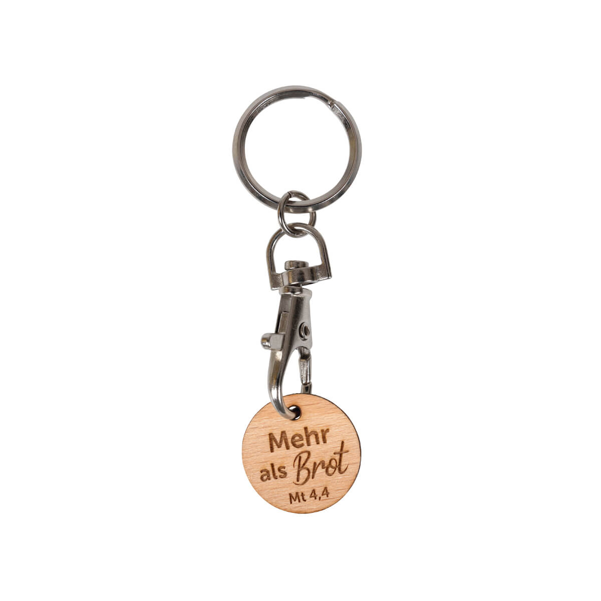 Mit Hilfe des praktischen Karabinerhakens und dem 1€-Chip aus Holz ist der Einkaufswagenchip immer griffbereit, graviert mit dem Vers „Mehr als Brot Mt 4,4“