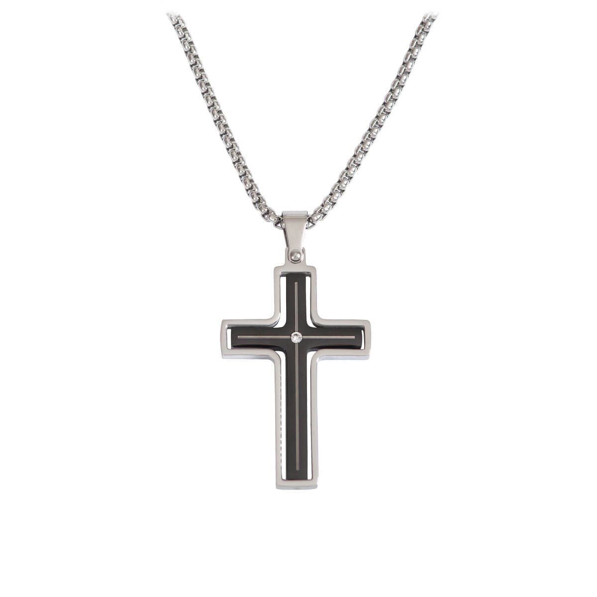Modische Gliederkette mit großem Kreuz aus glänzendem Edelstahl; das innere schwarze Kreuz ist mit einem Strass-Stein veredelt.