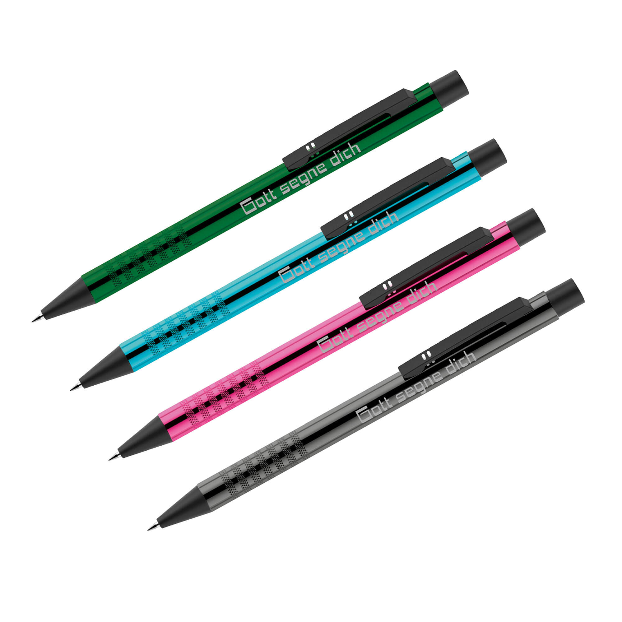 Kuli im schimmernden Metallic-Look: Druckkugelschreiber aus Metall in glänzenden Farben mit extravaganter Griffzone. Mit edler Lasergravur „Gott segne dich“, blauschreibende Mine. Erhältlich in 4 neuen Farben.