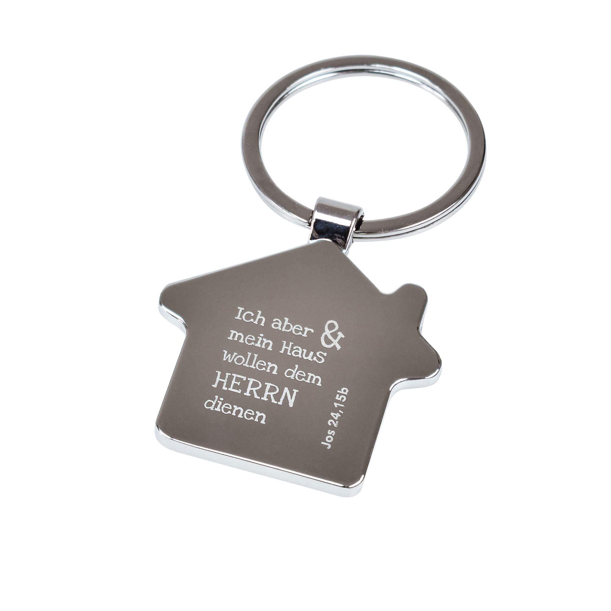 Hochglänzendes Metallgehäuse in Form eines Hauses mit Bambus-Inlay . Gesamtlänge: 4,4 cm, an stabilem Metall-Schlüsselring. Mit edler Lasergravur auf der Rückseite: „Ich aber & mein Haus wollen dem Herrn dienen Jos 24,15b“. Einzeln verpackt in einem Umschlag aus Kraftpapier.