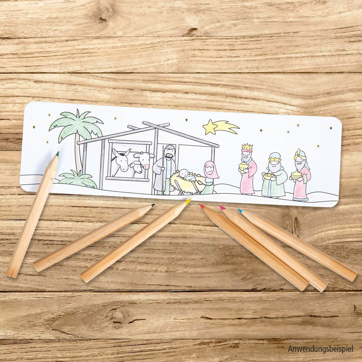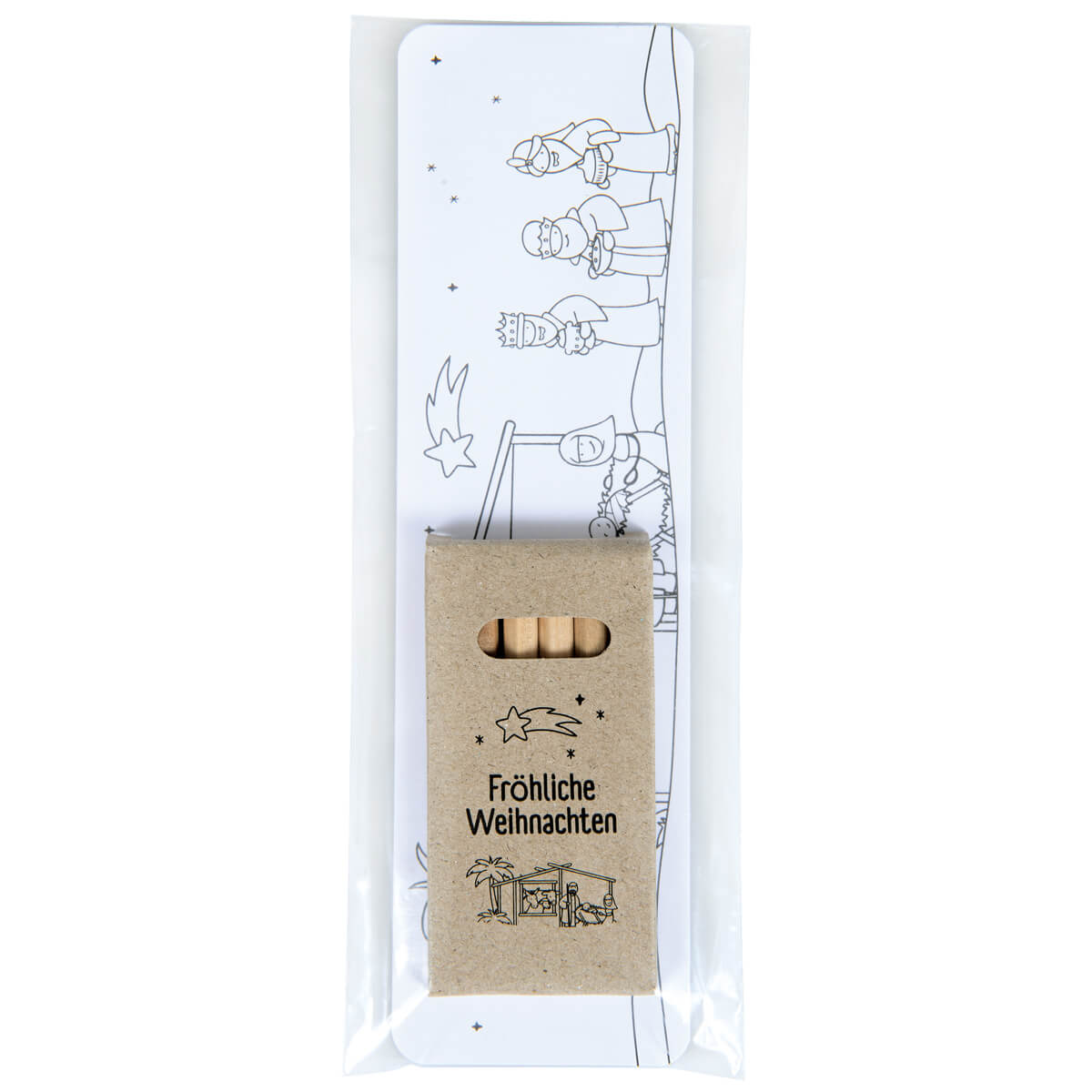 Schöne Beschäftigung für Kinder in der Weihnachtszeit oder als Dankeschön zum Krippenspiel: Set mit drei Lesezeichen zum Ausmalen und einer Schachtel mit sechs Buntstiften mit Aufdruck "Fröhliche Weihnachten". Die Lesezeichen sind beidseitig bedruckt auf stabilem Papier.