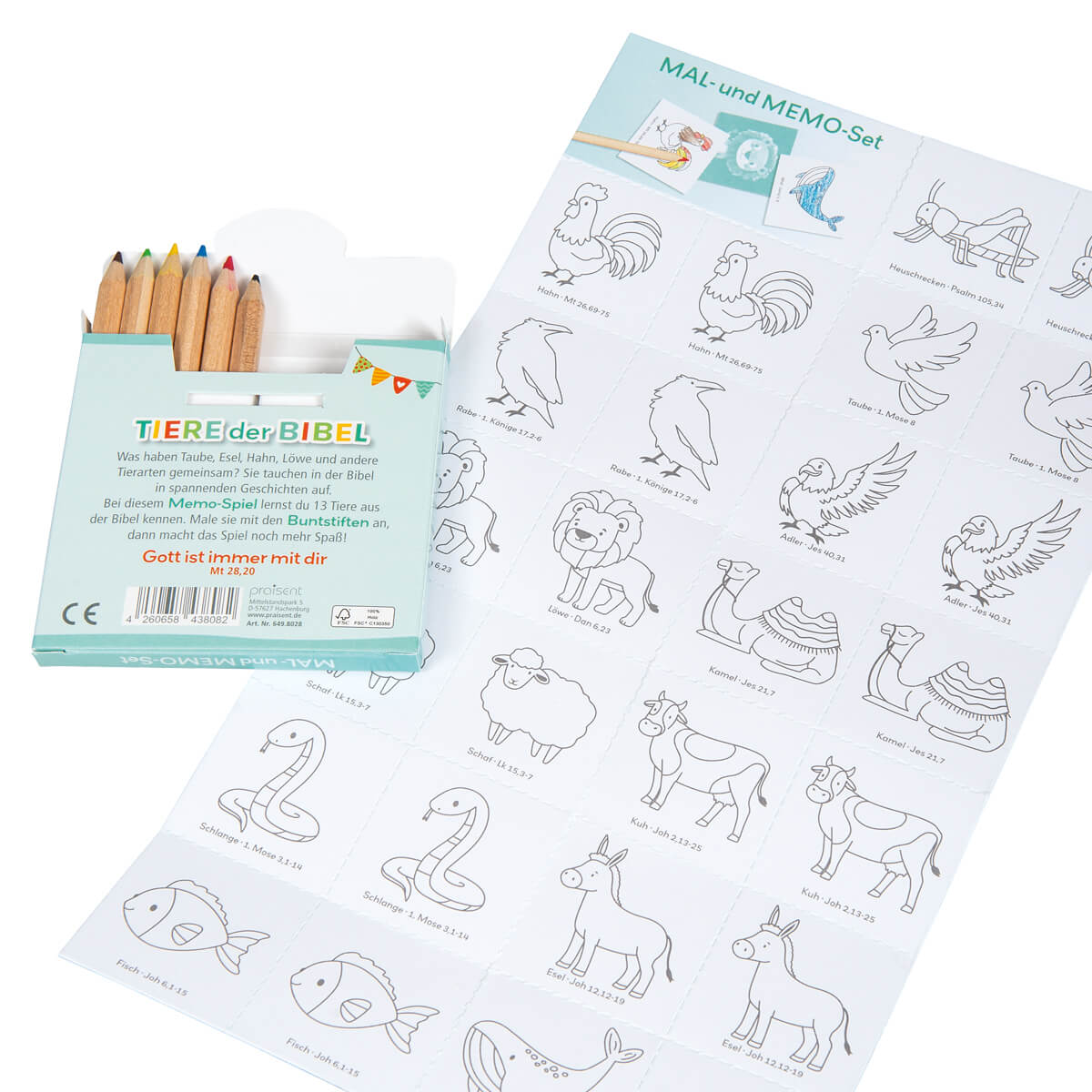 Bei diesem Memo-Spiel "Tiere der Bibel" lernen Kinder 13 Tiere aus der Bibel kennen.