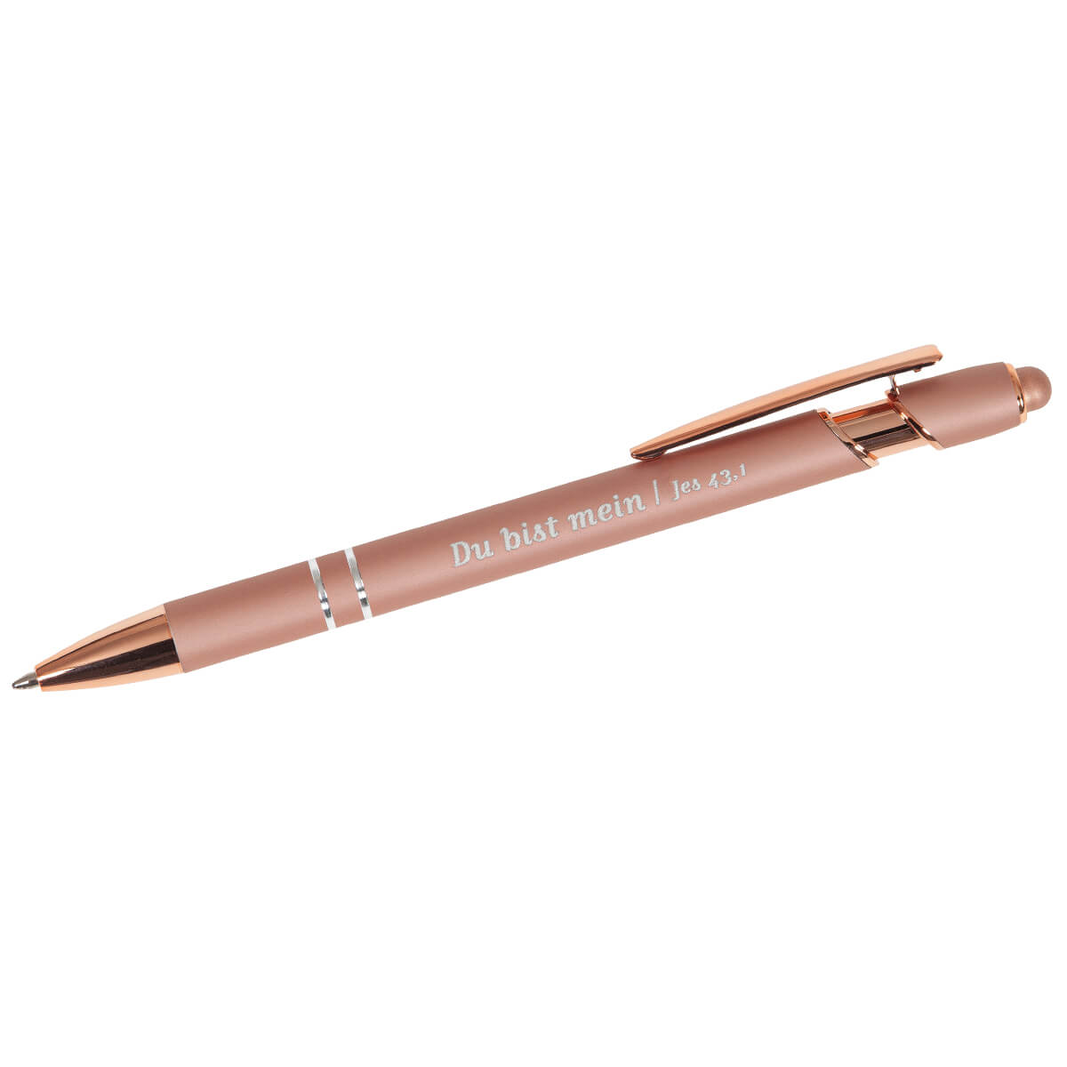 Hochwertiger Kugelschreiber Metallic in Rosegold-farben, mit Lasergravur Text: Du bist mein Jes. 43.1.