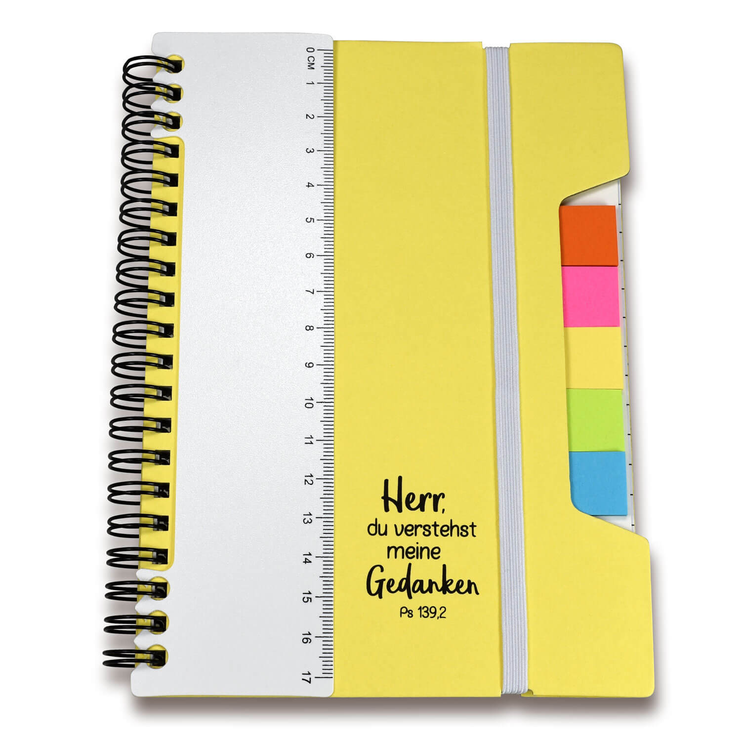 Kompaktes Notizbuch mit Ringbindung und elastischem Verschlussband, 13x18 cm, 60 linierte weiße Blätter und ein Adressblatt, abnehmbares Lineal (17 cm), Haftnotizstreifen (5 Farben, je 25 Stück), Aufdruck: "Herr, du verstehst meine Gedanken Ps 139,2"
