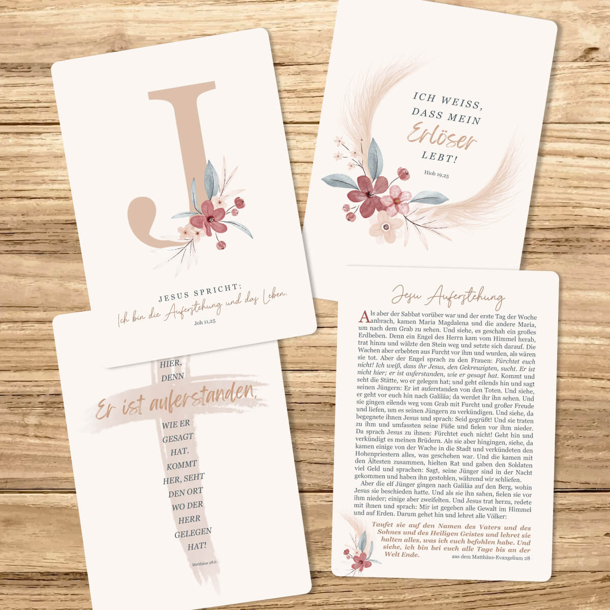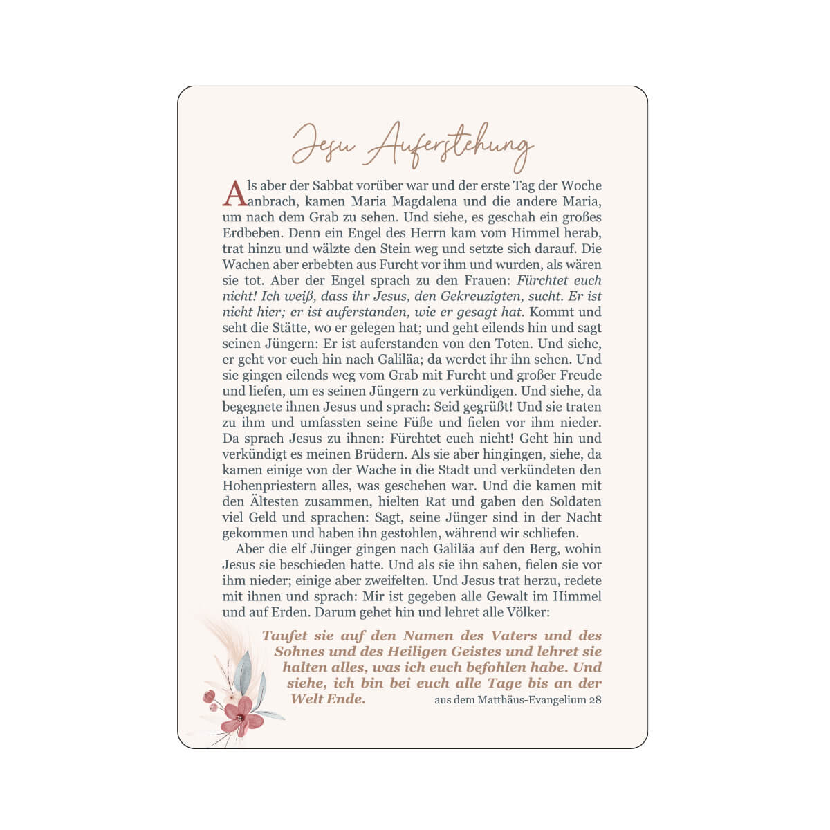 Für kleine Grüße oder als Mini-Poster: Postkarte zu Ostern im modernen Design mit der Auferstehungsgeschichte aus dem Matthäus-Evangelium 28. Gedruckt auf stabilem Postkartenkarton mit abgerundeten Ecken.