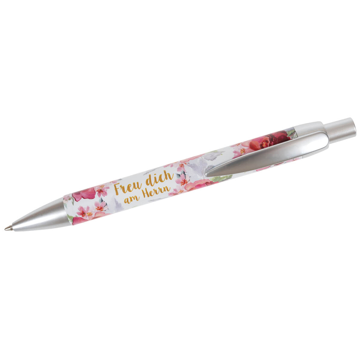 Ein schöner Kugelschreiber mit Motiv Pfingstrosen und Text: Freu dich am Herrn.