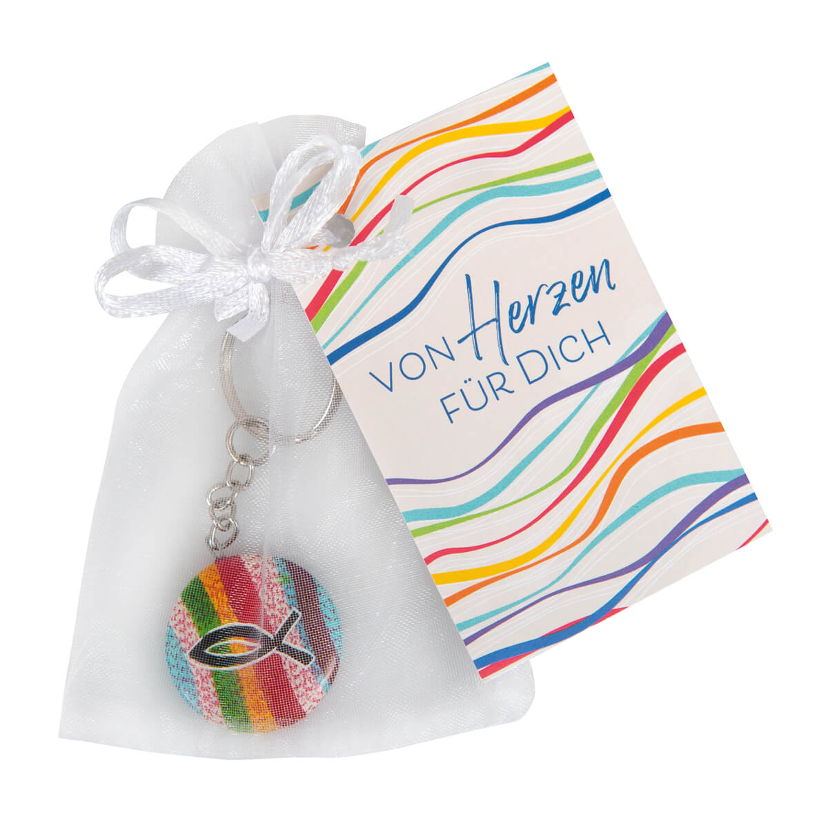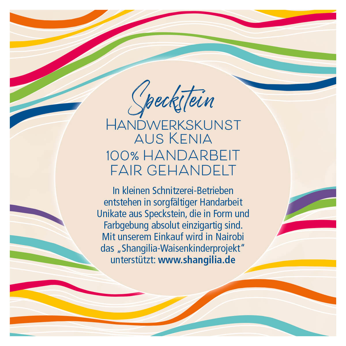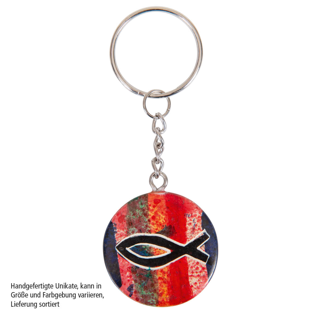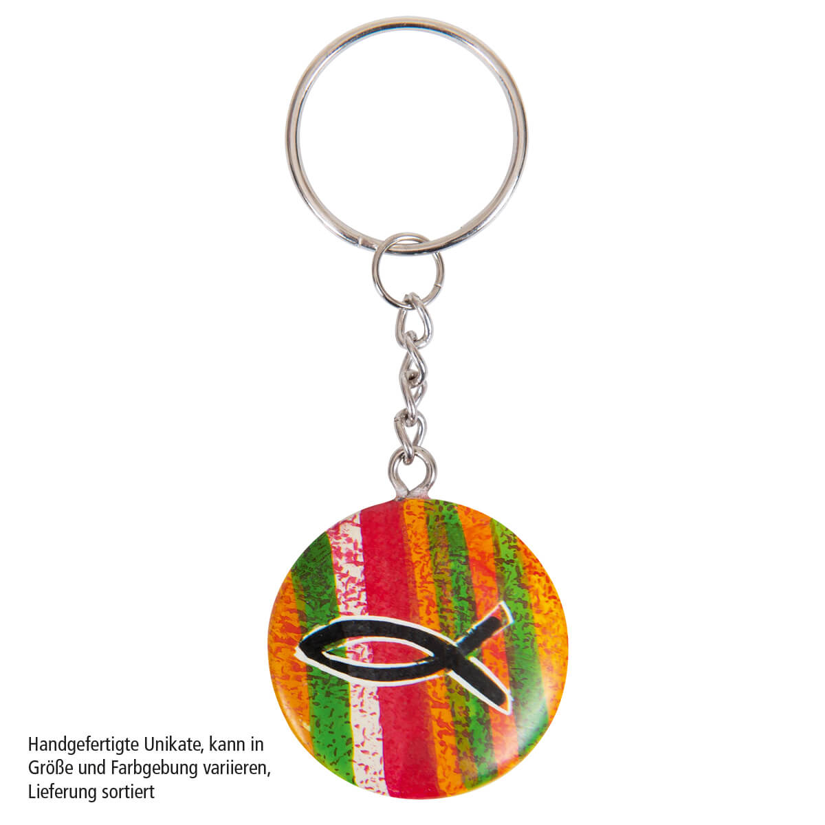 Handwerkskunst aus Kenia: Schlüsselanhänger mit rundem Anhänger aus Speckstein, schön bunt gestaltet mit Fisch-Symbol.