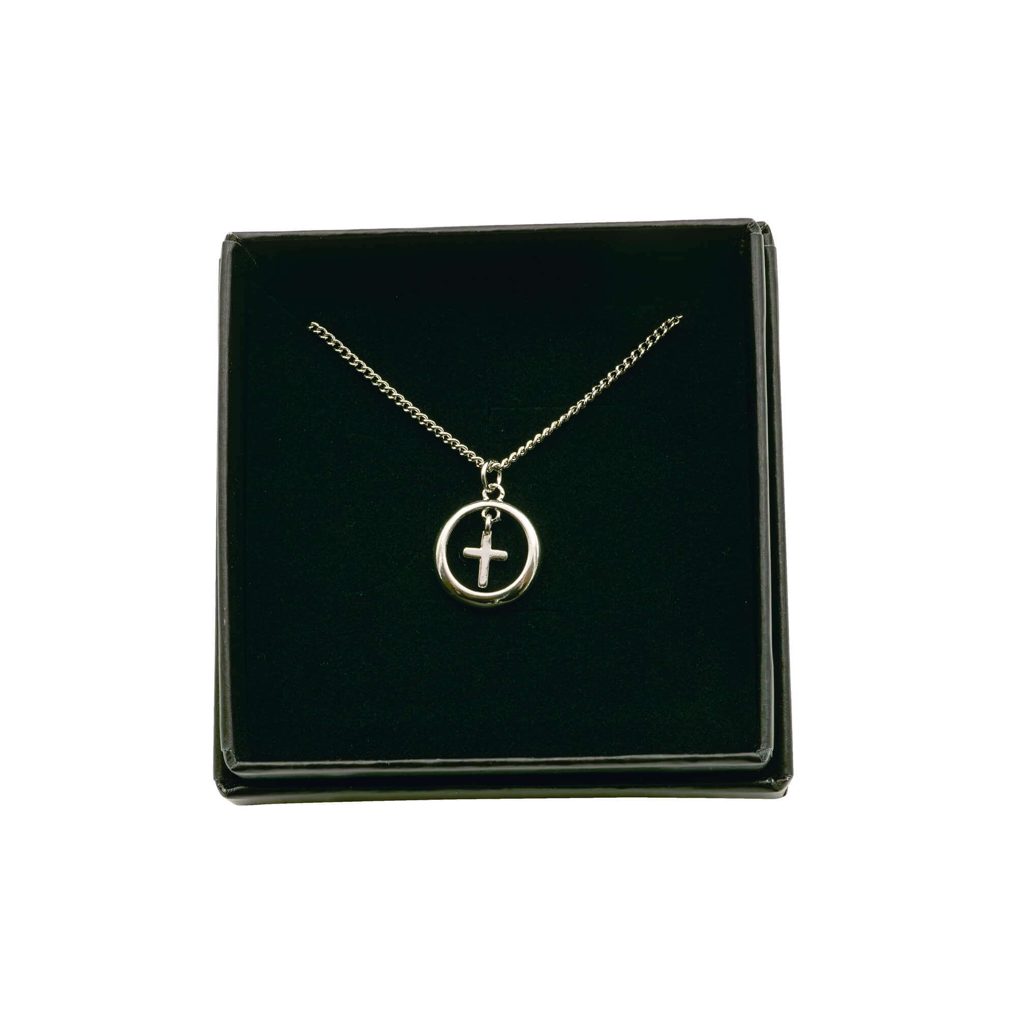 Elegante Halskette aus 925er Sterlingsilber mit filigranem Kreuzanhänger. Das Kreuz ist von einem zarten Ring umschlossen.