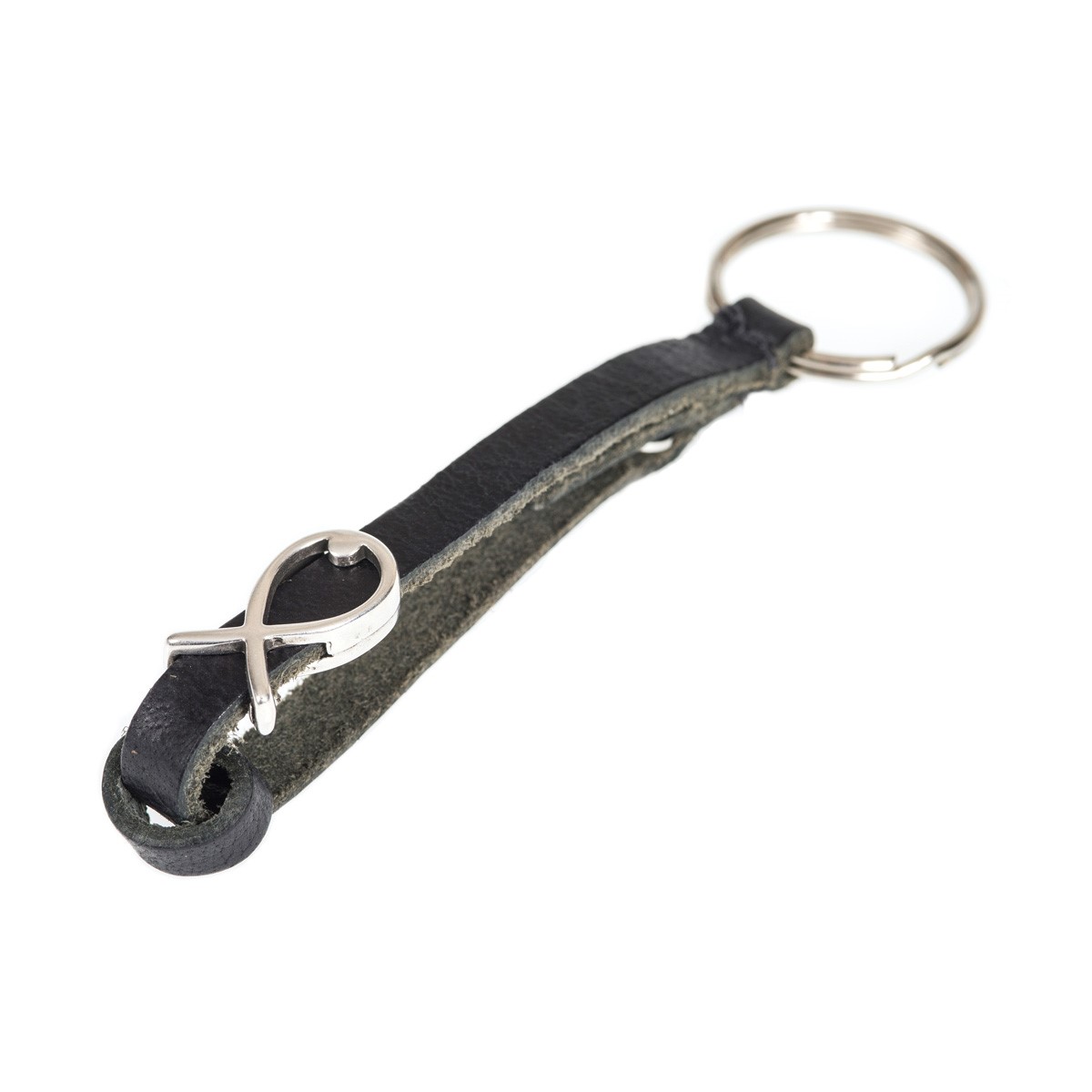 Hochwertiger Schlüsselanhänger mit schwarzer Lederschlaufe mit christlichen Symbol Fisch aus Metall.