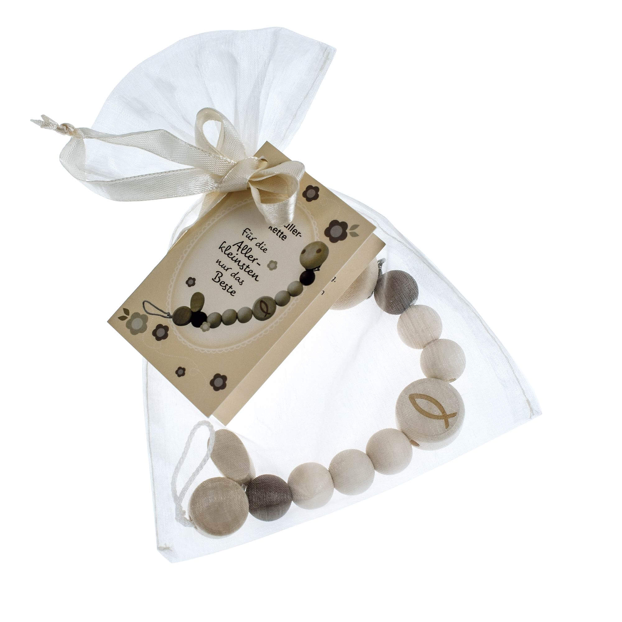 Schnullerkette gefertigt aus ausgesuchten heimischen Hölzern, ungiftige Farben, speichelecht, Naturperlen. Eine Perle ist mit dem Ichthys-Symbol lasergraviert. Holz natur, L 21 cm. Verpackt im Organza-Beutel.