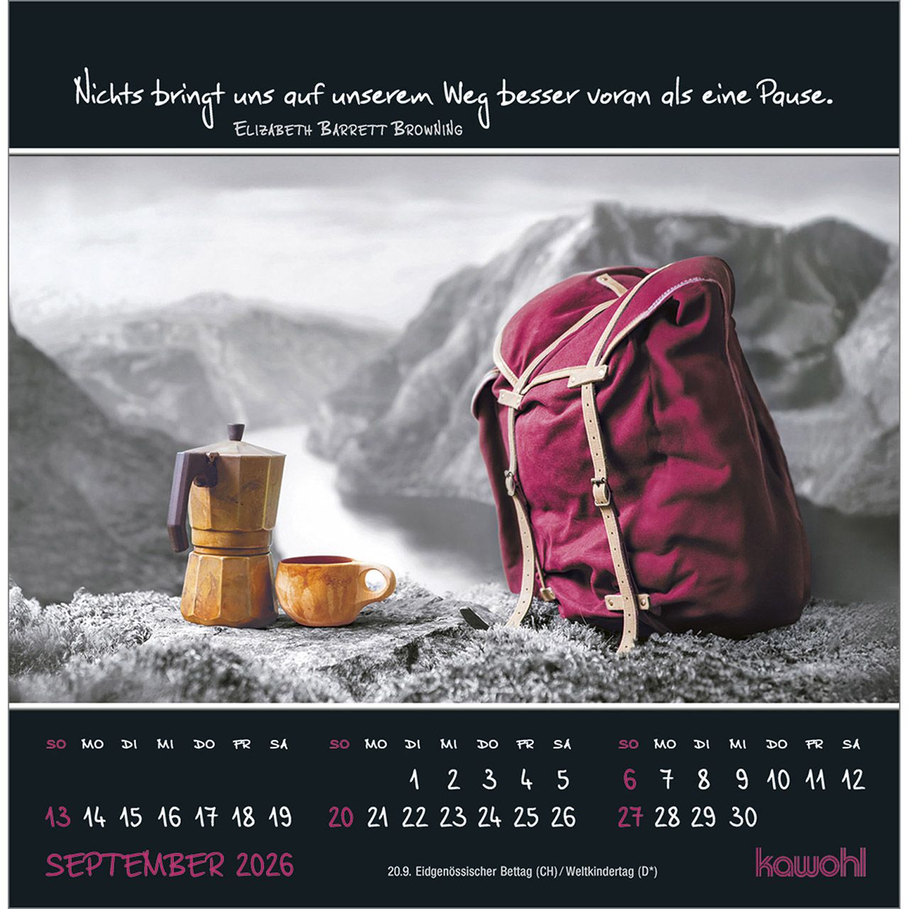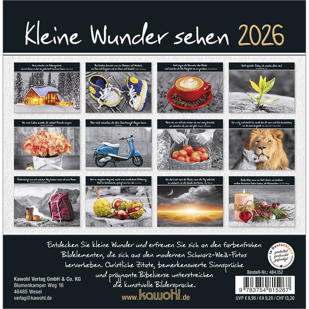 - Entdecken Sie Tag für Tag kleine Wunder und erfreuen Sie sich an den farbenfrohen Bildelementen, die sich aus den modernen Schwarz-Weiß-Fotos hervorheben. Christliche Zitate, bemerkenswerte Sinnsprüche und prägnante Bibelverse unterstreichen die kunstvolle Bildersprache.