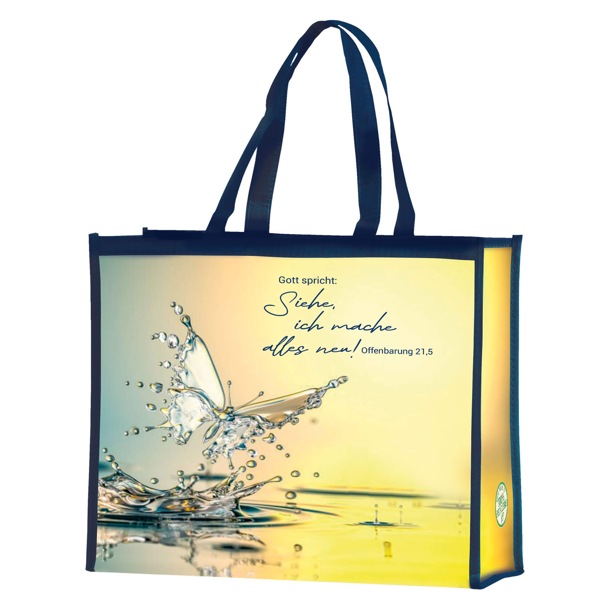 Nachhaltige und robuste Einkaufstasche aus Vliesfaserstoff, 100% recycelbar. Bedruckt mit dem Motiv der Jahreslosung 2026.