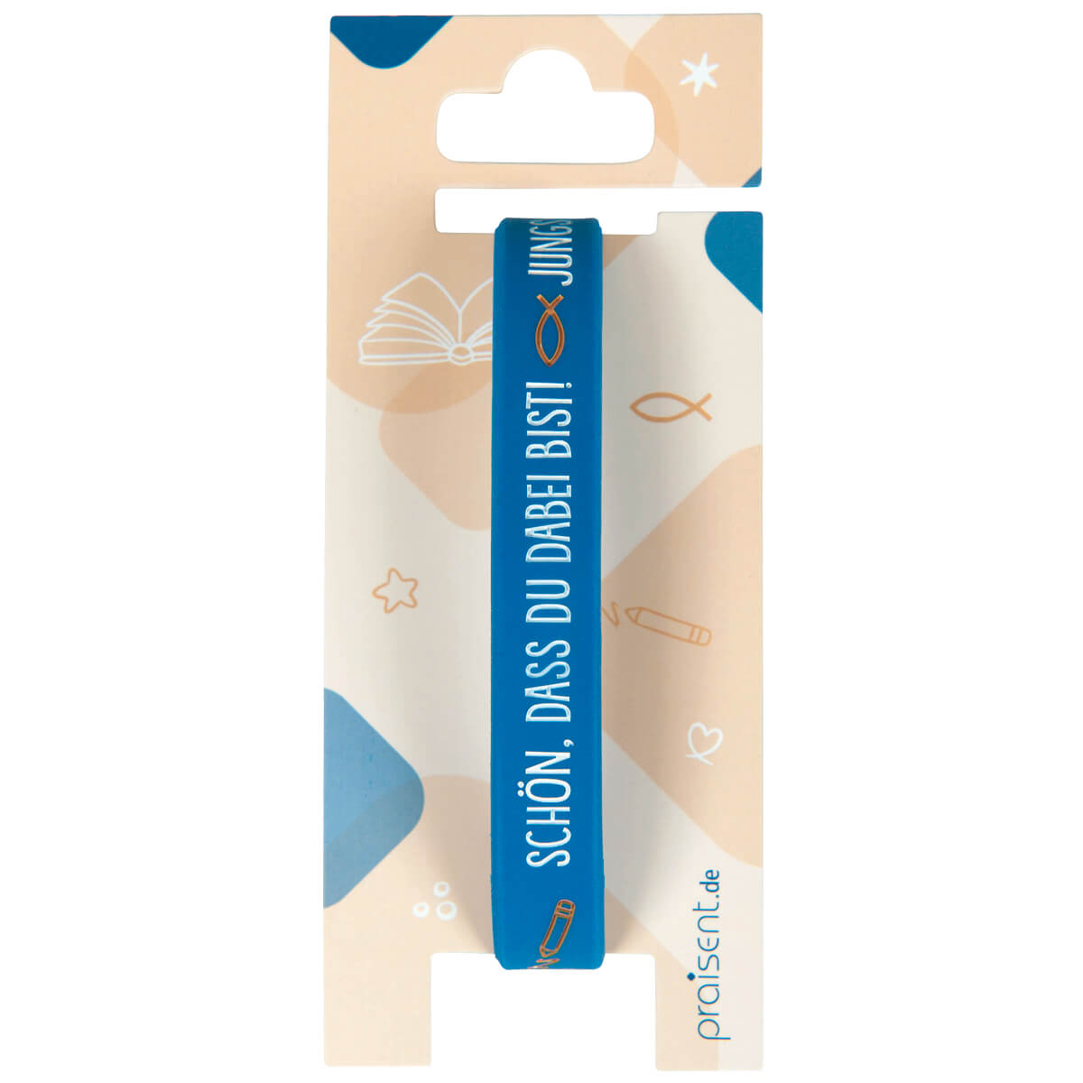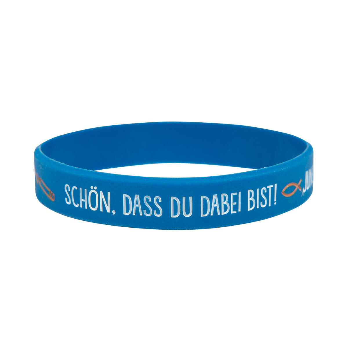 Tolles Accessoire für Kinder und junge Leute: Silikonarmband mit 2-farbigem Prägedruck "Schön, dass du dabei bist! Jungschar"