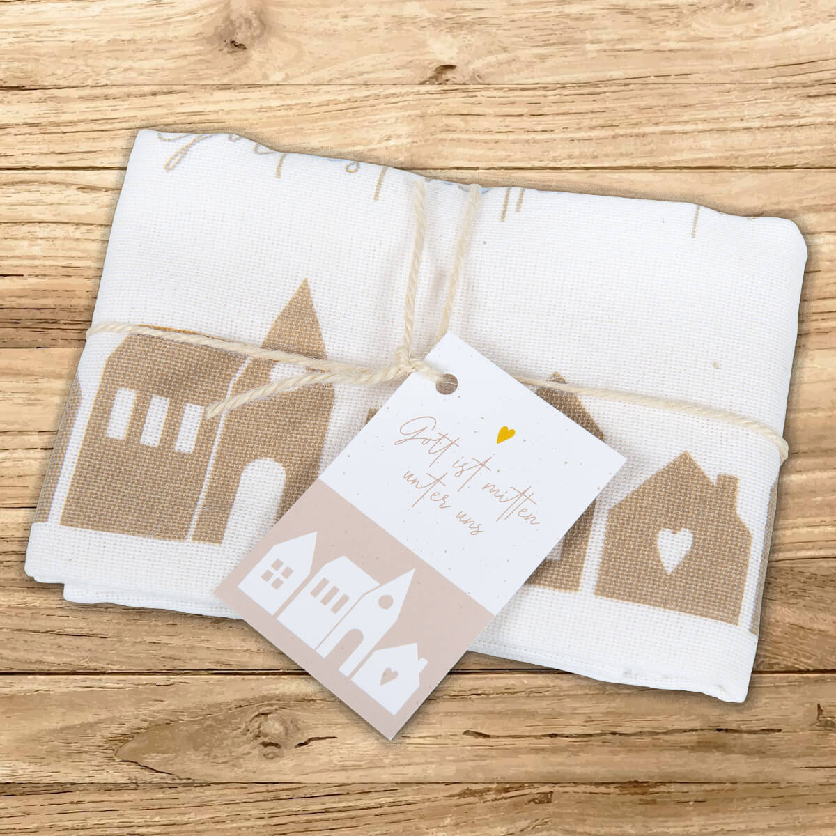 Naturweißes Geschirrtuch aus 100% Baumwolle mit trendigem Häuser-Motiv und Text: "Gott ist mitten unter uns".