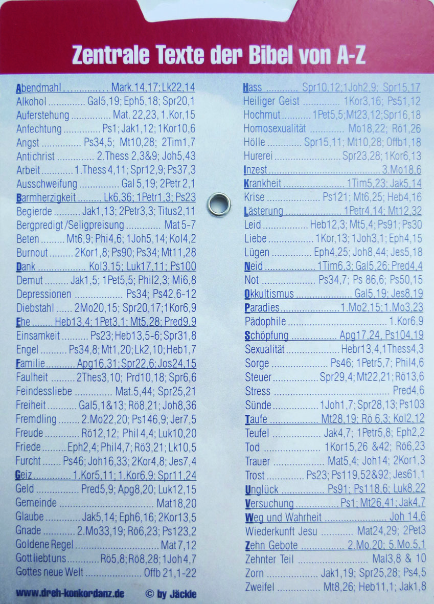 Rückseite: Aktuelle und immer wieder gesuchte Begriffe von Abendmahl bis Zweifel. 80 Begriffe verweisen auf fast 200 Bibelstellen. Als Einleger in die Bibel bestens geeignet, um im Hauskreis oder im Bibelgespräch schnellen Zugriff auf fundierte Antworten zu haben. Eines der kleinsten und praktischsten Wortregister der Bibel.