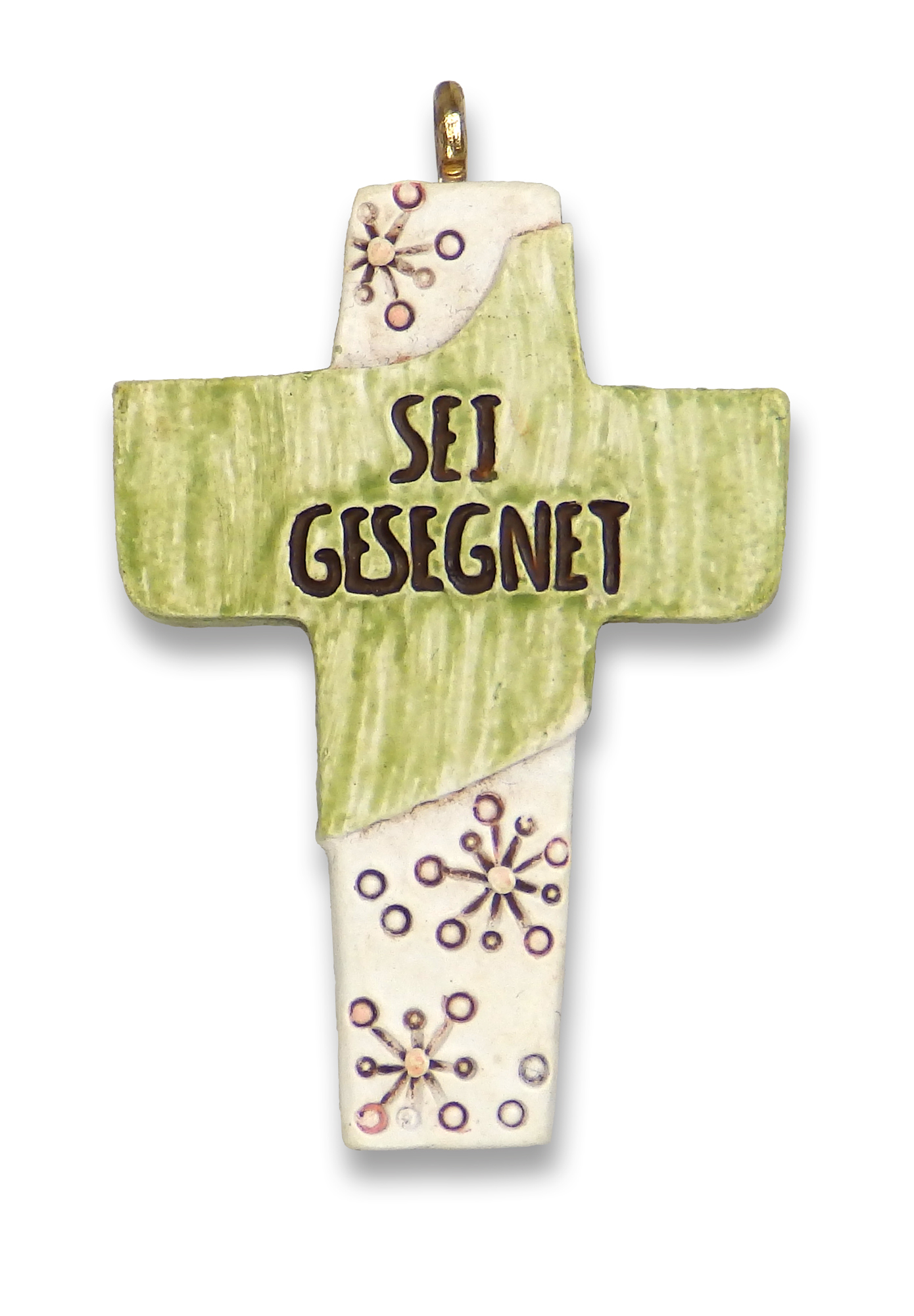 Kreuz-Anhänger aus Kunststein, mit Text "Sei gesegnet", 4 cm, mit Schleifchen auf Spruchkarte gebunden, in Cellophan verpackt