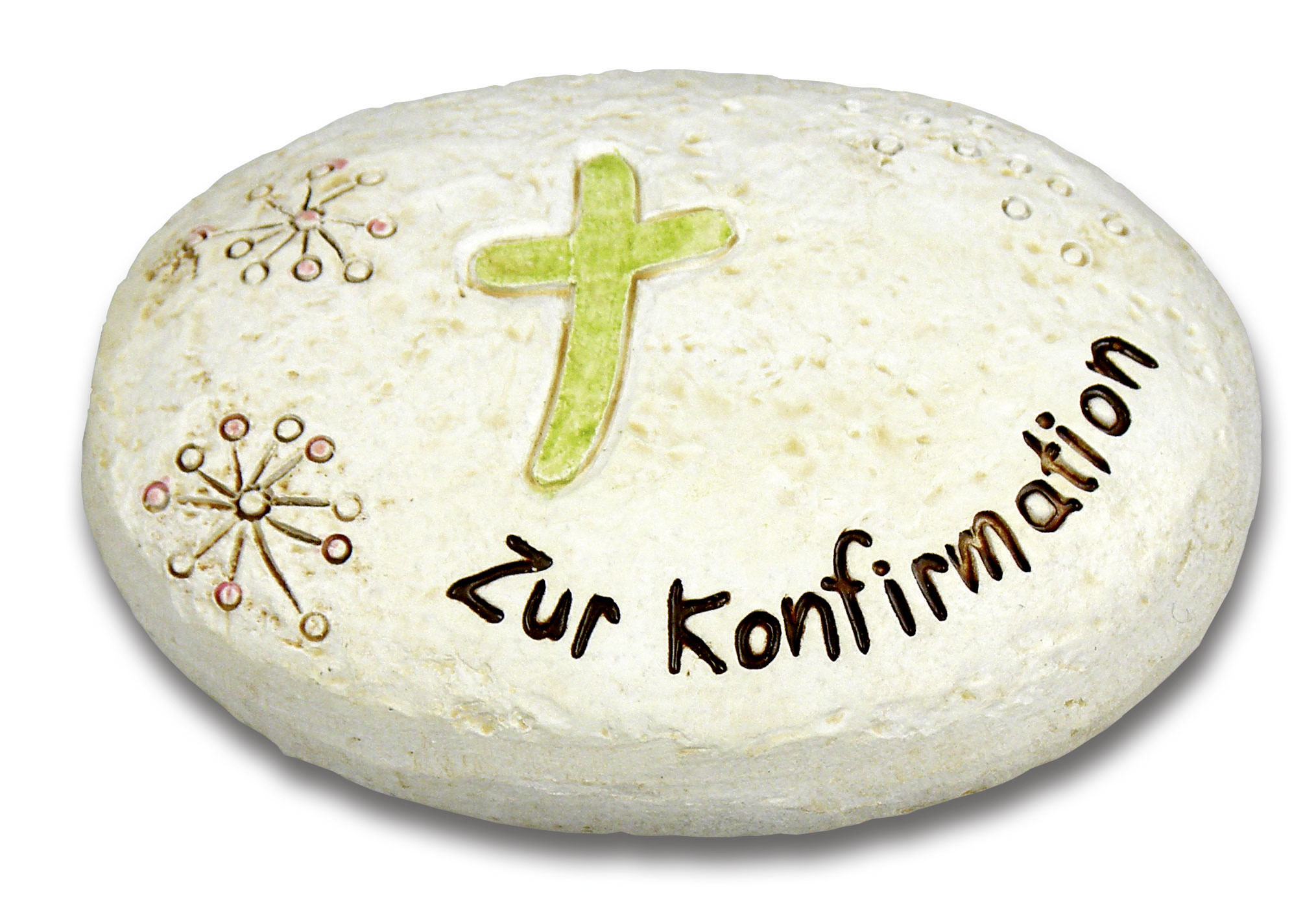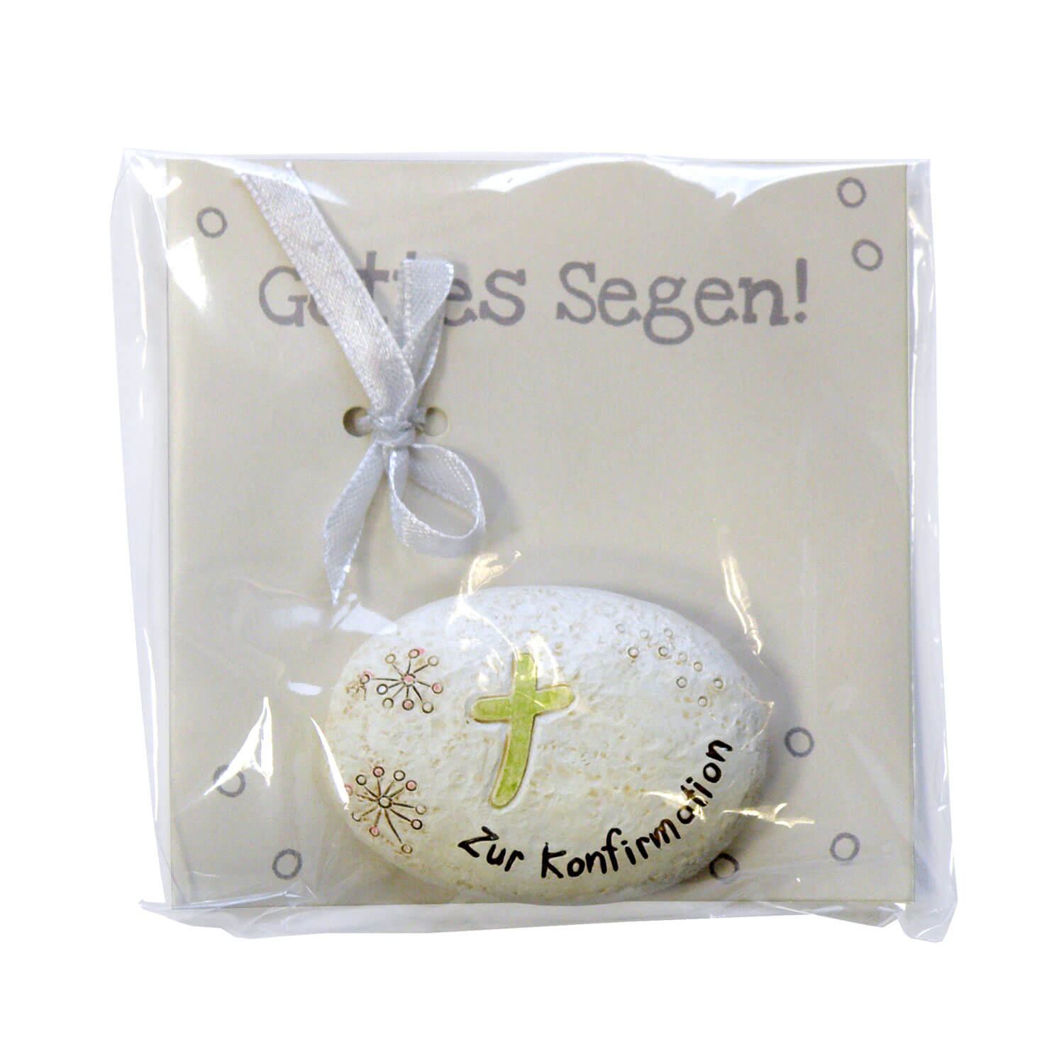 Geschenksteine sind "Mutmacher" aus Kunststein, 6 cm, verziert mit einem Kreuz und Ornamenten, auf Kärtchen mit christlichem Text "Mit Gottes Segen" und Schleifchen, in Cellophan verpackt