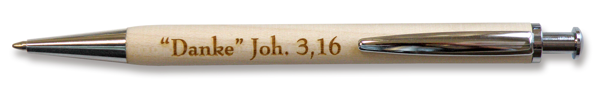 Kugelschreiber mit Holzschaft und Lasergravur "Danke", Joh. 3,16, verpackt in Etui