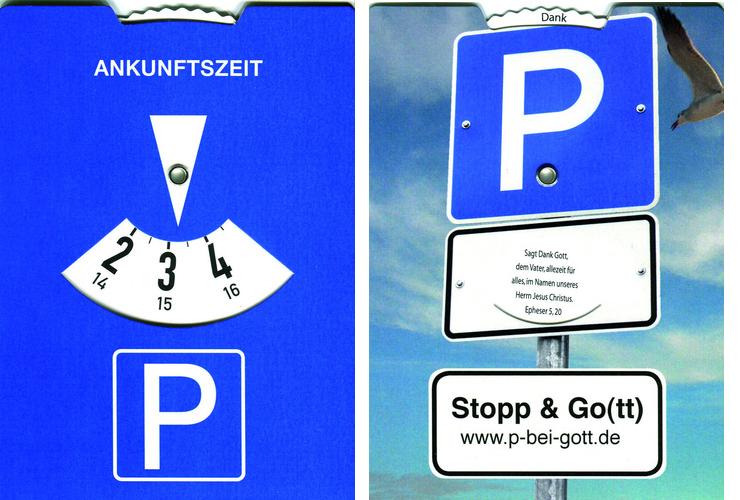 Auf der einen Seite eine ganz normale, "zulässige" Parkscheibe, auf der Rückseite erscheinen beim Weiterdrehen Bibelverse zu verschiedenen Themen - Alltagsnutzen verbunden mit einem kleinen Hinweis auf Gott und sein Wort.