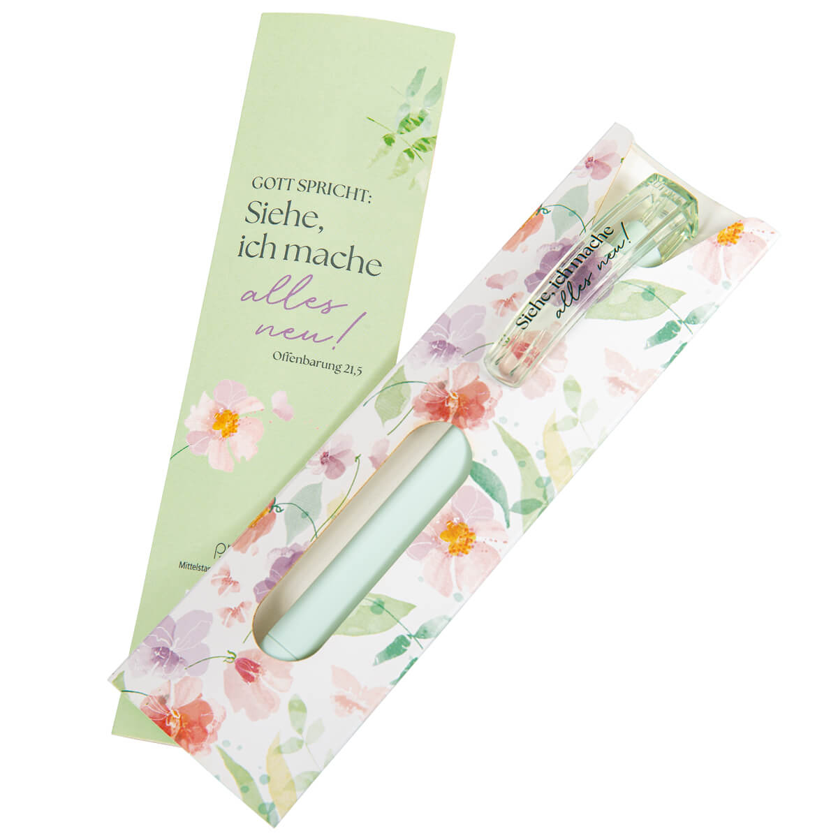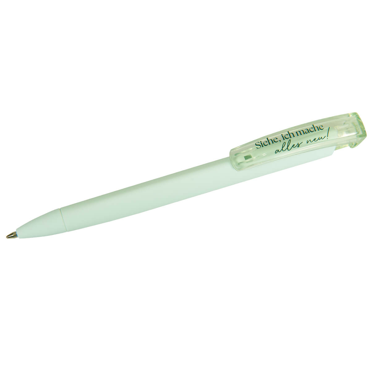 Die Jahreslosung 2026 auf einem hochwertigen Kugelschreiber mit Softtouch-Oberfläche in pastelligem grün. Ergonomische Dreiecksform, bedruckt mit "Siehe, ich mache alles neu!" auf dem transparentfarbenem Clip.