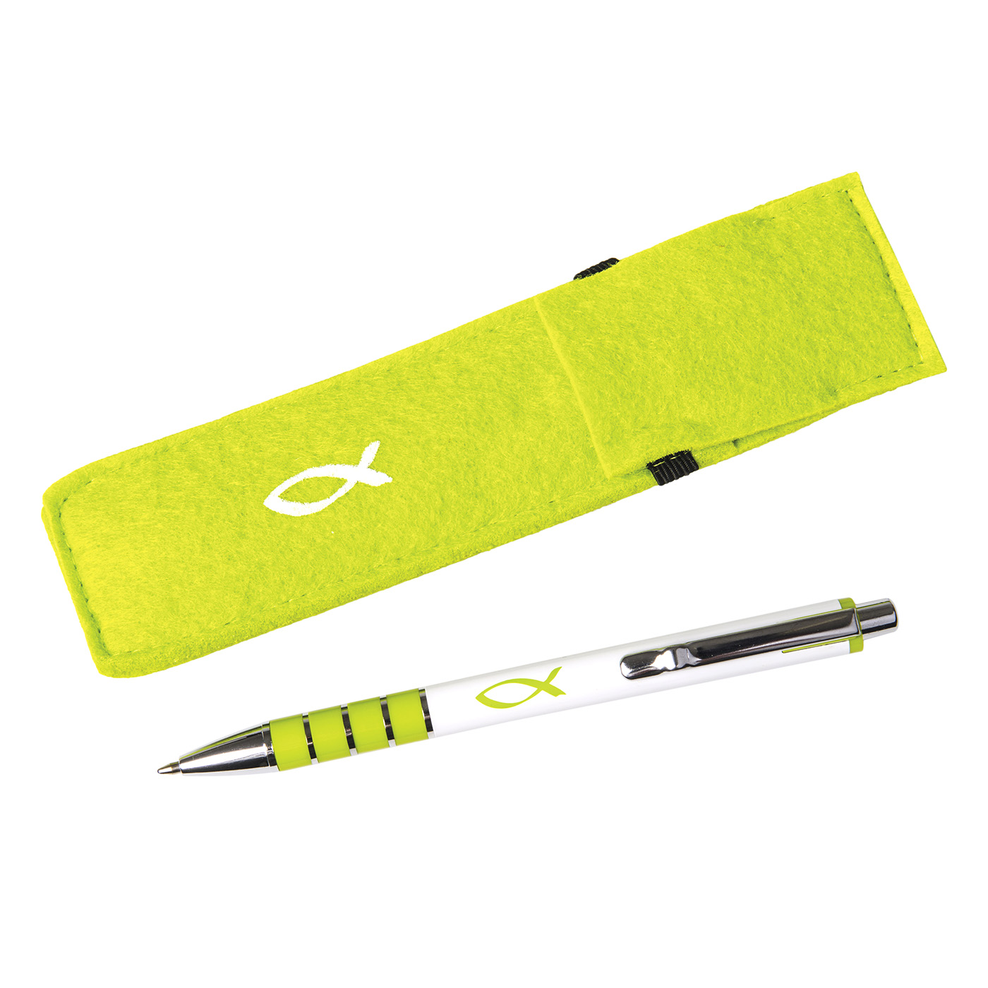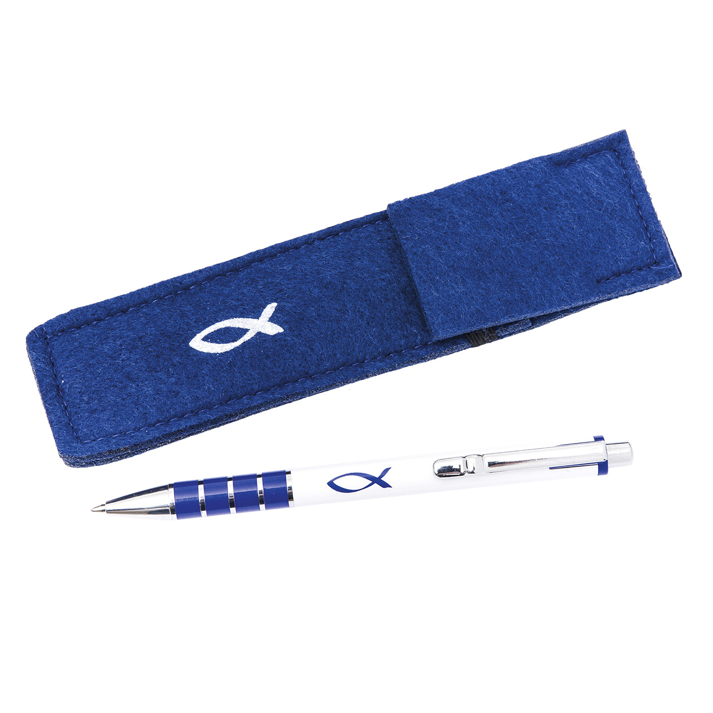 Trendiges Set! Kugelschreiber und Filz-Etui sind mit dem Fischsymbol bedruckt.