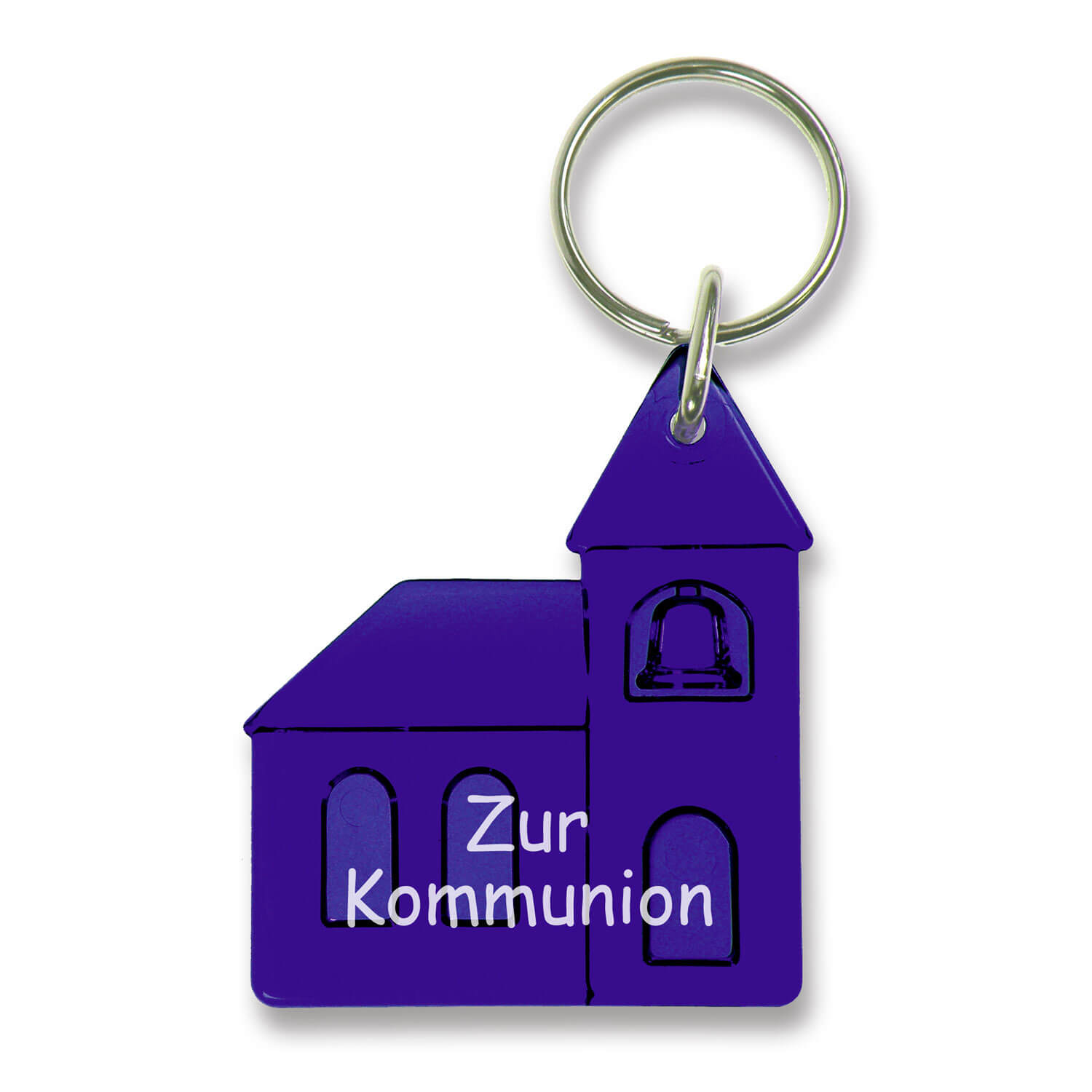 Schlüsselanhänger in Form einer Kirche aus transparentem Acryl, mit Aufdruck "Zur Kommunion", Größe 5,2 cm