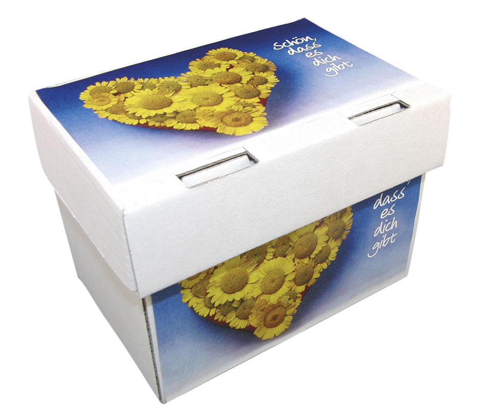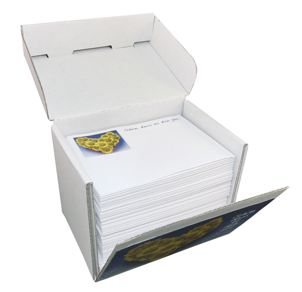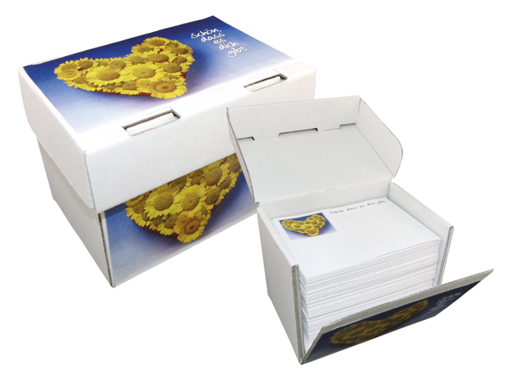 Mit dem Motiv Blumenherz und dem Text „Schön, dass es dich gibt“, mit 350 Notizzetteln 10x7 cm, abgesoftetes Motiv, wie Abb. Für den Schreibtisch, den Telefontisch. Zum Zuklappen, hält jedem Windstoß stand!